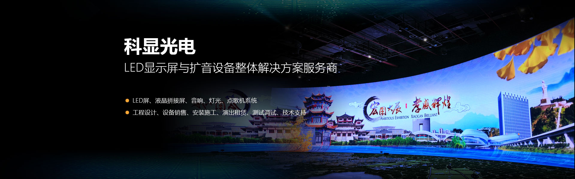 武漢科顯光電有限公司是一家集工程設計、設備銷售、安裝施工、演出租賃、測試調試、技術支持等多元化服務為一體的專業LED屏、液晶拼接屏、音響、燈光、點歌機系統集成服務商。在市政、交通運輸、銀行證券、體育場館、商場、機場、車站、港口、醫院、院校、教育系統、工商、稅務、KTV等領域得到廣泛應用。...